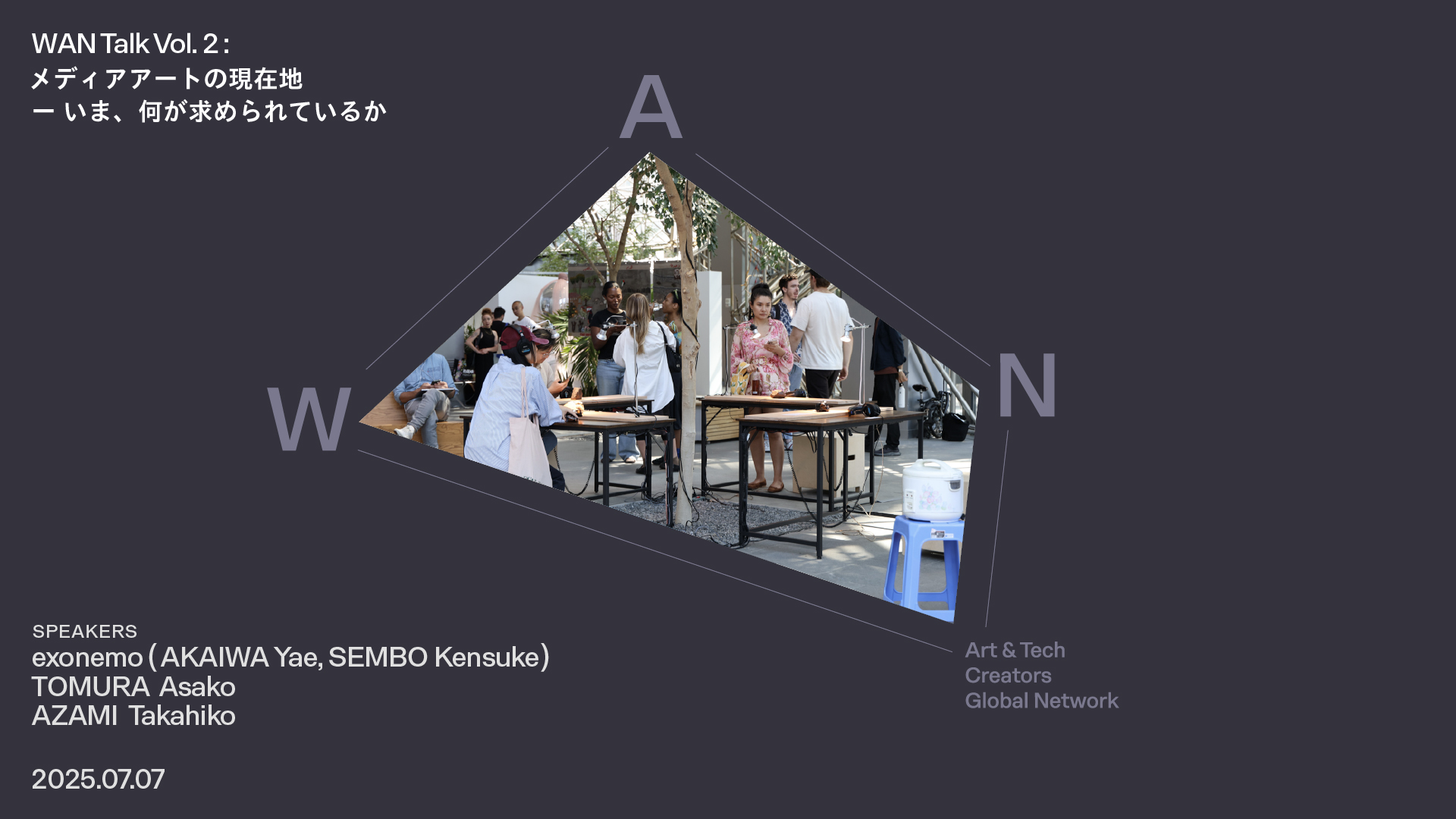 WAN トークは、メディアアート分野でグローバルに活躍できる日本人メディアアートクリエイター(アーティストやキュレーターなど)を戦略的に支援し、国際的なプレゼンスを強化するプログラム「WAN: Art & Tech Creators Global Network」によるトークシリーズです。