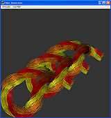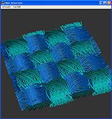 糸曲線をsinカーブによって定義し、三次元の糸モデルに糸の断面図を当てはめ繊維束モデルを作成。この繊維束モデルは特許技術だ。そして糸の太さ、経糸と緯糸それぞれの繊維の本数、糸の断面形状、撚りの強さ・方向・本数、織クリンプの曲率をパラメーター設定すれば、織物の質感を三次元でシミュレーションできるようにした。写真のように、1本1本の糸から繊維束をつくり三次元の織構造としているため、見る角度や大きさを変えながら完成の状態の質感を立体的に確認できる。