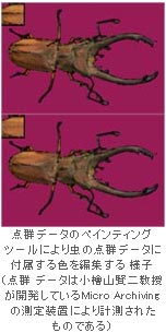 model Acquisition」にも協力している。これは、複数の光学カメラによって撮影した昆虫の画像から、やはり点群データによるモデルを生成し、それをレンダリングする手法や、点群データに付属する色を編集するためのペインティングツールを開発している。小檜山教授の研究は、2001年のSIGGRAPHの