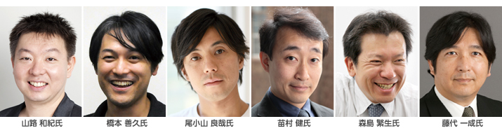 前半がカリキュラムの側面から議論が行われたのに対して、後半のパネルディスカッション「表現を支える技術の可能性、今後の課題と方向性とは!?」では、企業と研究室のつながりなど、技術面から見た産学のあり方について議論が行われました。パネリストは産業界からプレミアムエージェンシー代表取締役の山路和紀氏、スクウェア・エニックスCTOの橋本善久氏、drawiz代表取締役の尾小山良哉氏。学術界から東京大学大学院教授の苗村健氏、早稲田大学先進理工学部教授の森島繁生氏、そしてモデレータもつとめた慶應義塾大学理工学部の藤代一成氏です。