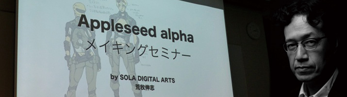 3月2日に改訂新版を発行した CGクリエイター向け書籍「ディジタル映像表現」と「入門CGデザイン」の一環として、福岡にて4月25日、制作の最新動向をご紹介するセミナー「CG表現のいま-3DCGが変えたアニメ表現とは-」を開催しました。アニメーション分野からSOLA DIGITAL ARTS代表の荒牧伸志監督、神風動画代表の水﨑淳平氏にご登壇いただきました。その中から「荒牧伸志監督が語る-『アップルシード アルファ』のメイキングからみる表現の追求-」をお届けします。
