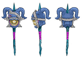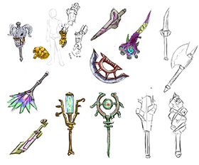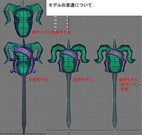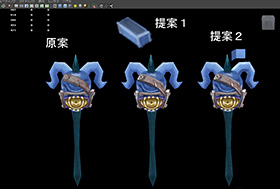 松崎先生のデザイナー研修では、『VALIANT LEGION』に登場する武器をMayaでモデリングすることになりました。「切りの良いところまで進むたびに、私の担当になった2名のデザイナーがデータをチェックして、フィードバックをくださったのです。それが非常に勉強になりました。一見すると形ができているように見えても、そのままゲームに組み込めるかというと、そうではなかったのです」。今回のゲームはスマートフォンでプレイすることが前提のオンラインゲームだったので、ポリゴンの数やテクスチャの解像度を抑えつつ、見栄えの良いモデルをつくる必要がありました。「ここが駄目だ、あそこが駄目だと指摘していただくことで、学生のデータとプロのデータの距離を、身をもって実感することができました。学んだことを、今度は私が学生にフィードバックしていかなければいけません」。