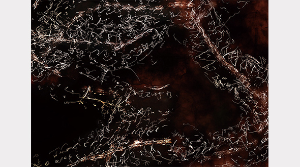 ススをつけた紙の上に昆虫を離し、その足の動きを記録し作成された一連の静止画作品。昆虫を一つのアプリケーションのような感覚で扱っている点が面白い。たとえば、アドビ社のイラストレーターを使うとグラフィックはなめらかなベクターデータの曲線が描け、それをGIF画像として書き出せば256色という制限によって独特な粒感が与えられるように、アプリケーションやGIFなどの圧縮技術は、それ自体がもつ能力・制限によって特有の質感を生み出す。そういう質感は当たり前のものとして作品は作られるので、普通はあまり意識されることはないのかもしれない。しかし本作ではそういう質感を、ムカデやカブトムシといった昆虫から意識的に引き出して作られている。風や太陽、木の葉など自然現象からグラフィックを得ようとする手法は存在しているが、本作も昆虫という「ツール」に丁寧に向き合っていると感じた作品である。
