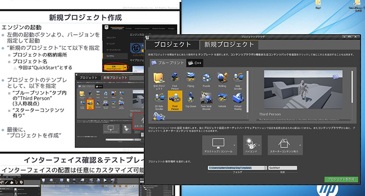 クイックスタートでは、プロジェクトの作成方法やインタフェースの説明やキャラクタやカメラの操作方法、マテリアル設定やモデルへのコリジョンの設定など、これから進めるハンズオンセミナーに必要な基本知識をレクチャーします。講師の用意するテキストも非常に詳細に書かれているので安心です。 |