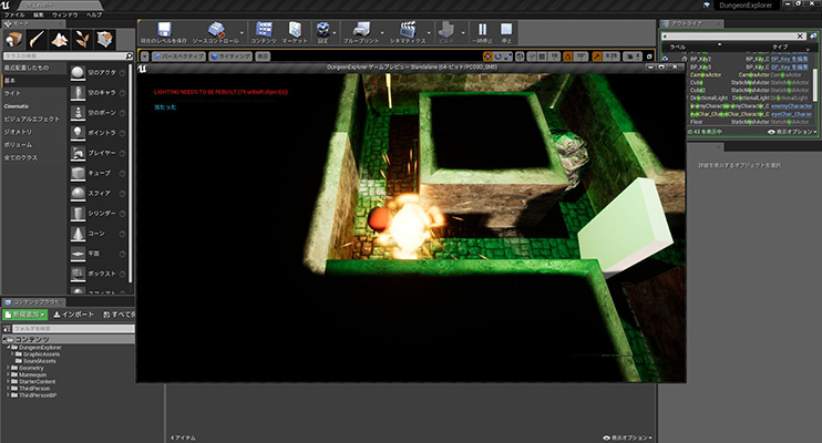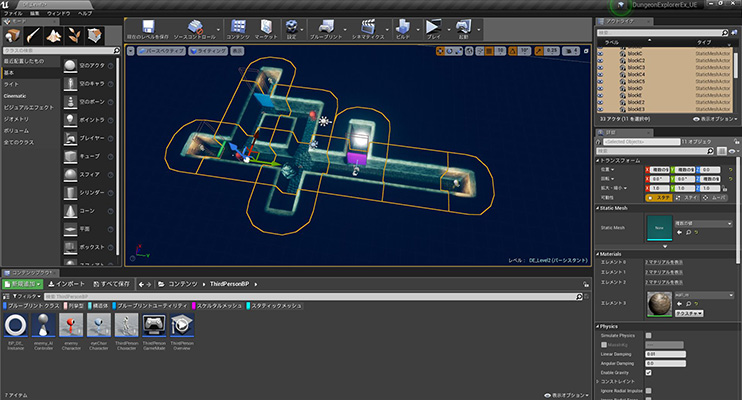 ここから2日目の講義です。まずは、Physicsシミュレーションの設定をしていきます。UE4などのゲームエンジンでは簡単な設定で障害物の岩をプレイヤーが転がしたり、回転扉の設定をしたりすることができます。あとはエネミーにつかまるとプレイヤーが爆発してゲームオーバーになる設定などをここではやっていきます。