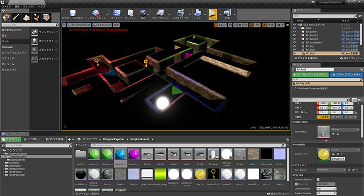 講師が準備したゲームは、プレイヤーがカギを3つ取ってゴールに向かうというシンプルなものでした。そのゲームを実現するためにも、さまざまなインタラクションの設定が必要になってきます。この講義では、そうしたインタラクションの設定をブループリントで一から組み立てていく演習になっています。具体的にはプレイヤーがキーの入力で動いたり、カメラがプレイヤーに追従したり、鍵をとると壁が消えたりなどの設定をしていきます。だんだん内容が難しくなってきます。 |