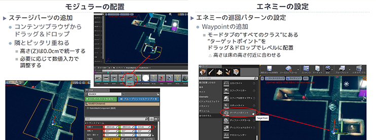 一通りプレイしてゲームのルールやマップの構造を理解したあとに、別のマップを作る演習を進めます。このマップは、組み替えて拡張できるようにパーツ分けされています。そのパーツをコピーしたり移動させたりしながら、別のマップをつくっていきます。マップ以外にも、鍵やゴールの設定やエネミーの巡回経路の設定などをしていきます。こうした設定ひとつひとつのバランスでゲームの難易度が大きく変わります。こうした演習を通じてレベルデザインの基本を体験していきます。UE4などゲームエンジンを使うと、設定や配置を変更してすぐにプレイして難易度の確認ができるので、ゲームの面白さを追求するための試行錯誤を何度も繰り返すことができる事が分かります。 |