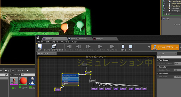 いよいよセミナーも終盤にはいっていきます。ゲームAIの講義では、NavMeshをつかってエネミーの行動範囲を設定したり、ビヘイビアツリーを使ってエネミーの状況に応じた設定をしたりしていきます。エネミーはプレイヤーをみつけると一定時間追いかけ回してくる設定をするのですが、設定どおり、追いかけまわしてくれると感動します。