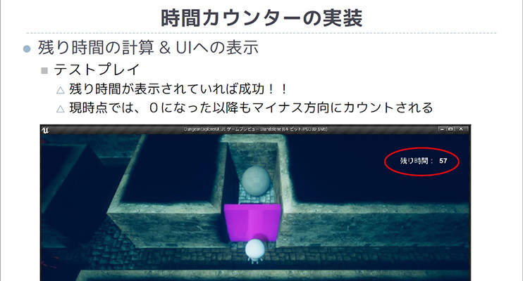 この時間では、画面に表示される情報表示をどのように設定していくかを学びます。残機数や制限時間の表示などゲームを進める上で必要な情報を状況に応じて表示する必要があります。こうした情報もブループリントをひとつずつ設定していきます。