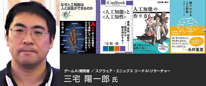 プロフィール:株式会社スクウェア・エニックス テクノロジー推進部 リードAIリサーチャー。デジタルゲームにおける人工知能技術の発展に従事。国際ゲーム開発者協会日本ゲームAI専門部会チェア、日本デジタルゲーム学会理事、芸術科学会理事、人工知能学会編集委員。共著『デジタルゲームの教科書』『デジタルゲームの技術』『絵でわかる人工知能』(SBCr) 、著書『人工知能のための哲学塾』(BNN新社)、『人工知能の作り方』(技術評論社)。 |