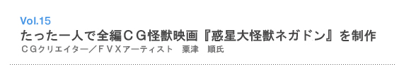 第1作以来のゴジラをこよなく愛し、1999年公開の『ガメラ3』を劇場で見てCGを志したという粟津氏はもともとは愛知県立芸術大学大学院で日本画を専攻したというユニークな経歴。トライデントコンピュータ専門学校デジタルクリエイター研究科で学んだ後、映像プロダクション・(有)マリンポストで怪獣映画や特撮映画などのCGデザインやVFXを担当し、ネガドンを制作するために独立。自作の『大怪鳥マガラ襲来』でCG-ARTSの「学生CGコンテスト」アニメーション部門に入選したこともある。